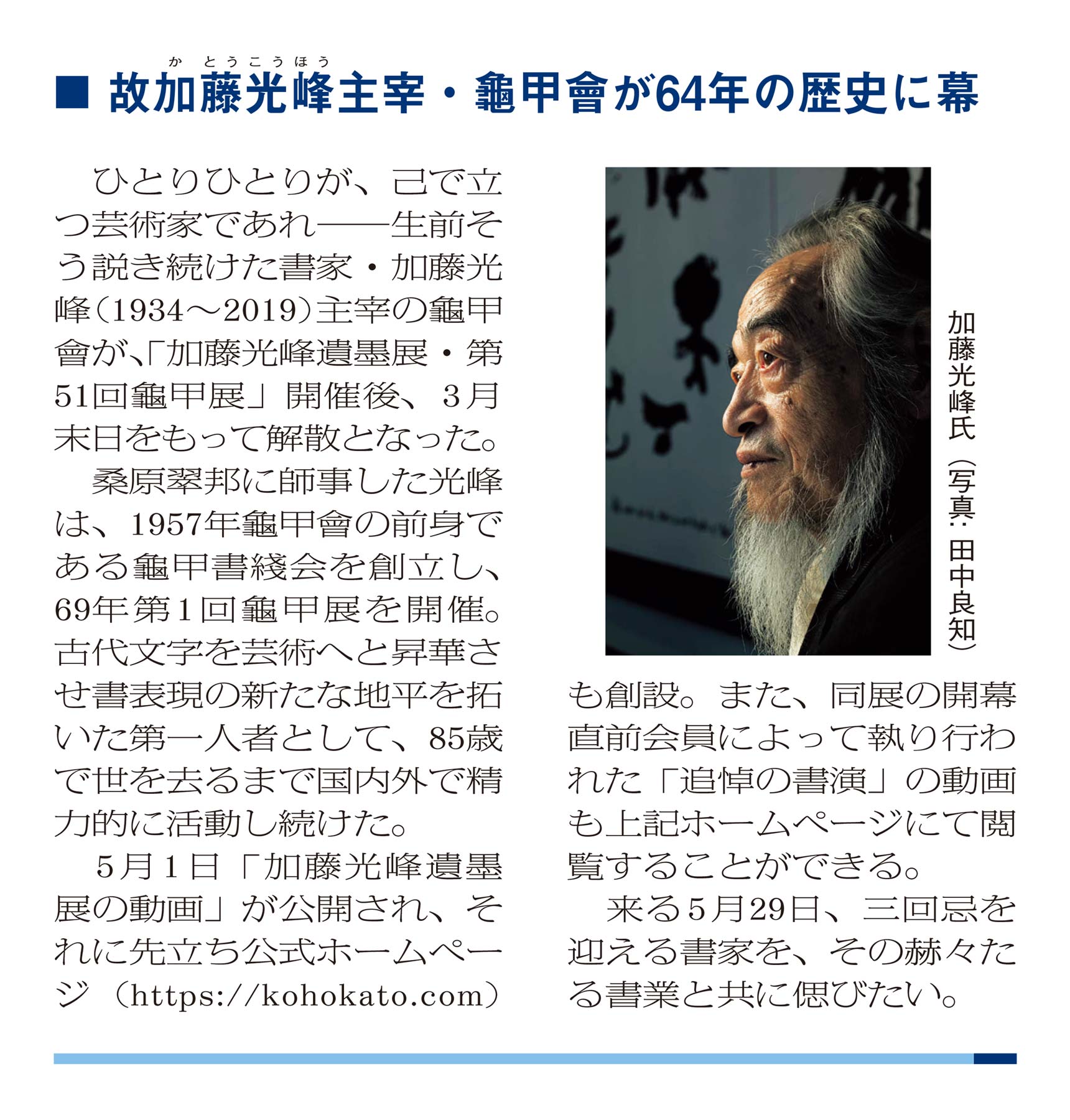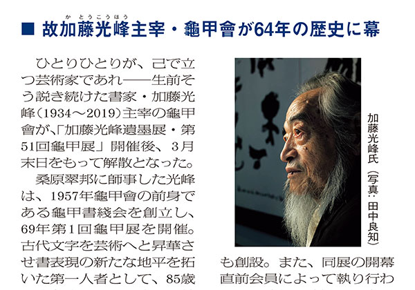 ひとりひとりが、己で立つ芸術家であれ――生前そう説き続けた書家・加藤光峰(1934~2019)主宰の亀甲會が、「加藤光峰遺墨展・第51回亀甲展」開催後、3月末日をもって解散となった。 桑原翠邦に師事した光峰 は、1957年亀甲會の前身である亀甲書綫会を創立し、69年第1回亀甲展を開催。古代文字を芸術へと昇華させ書表現の新たな地平を拓いた第一人者として、85歳で世を去るまで国内外で精力的に活動し続けた。… リンク