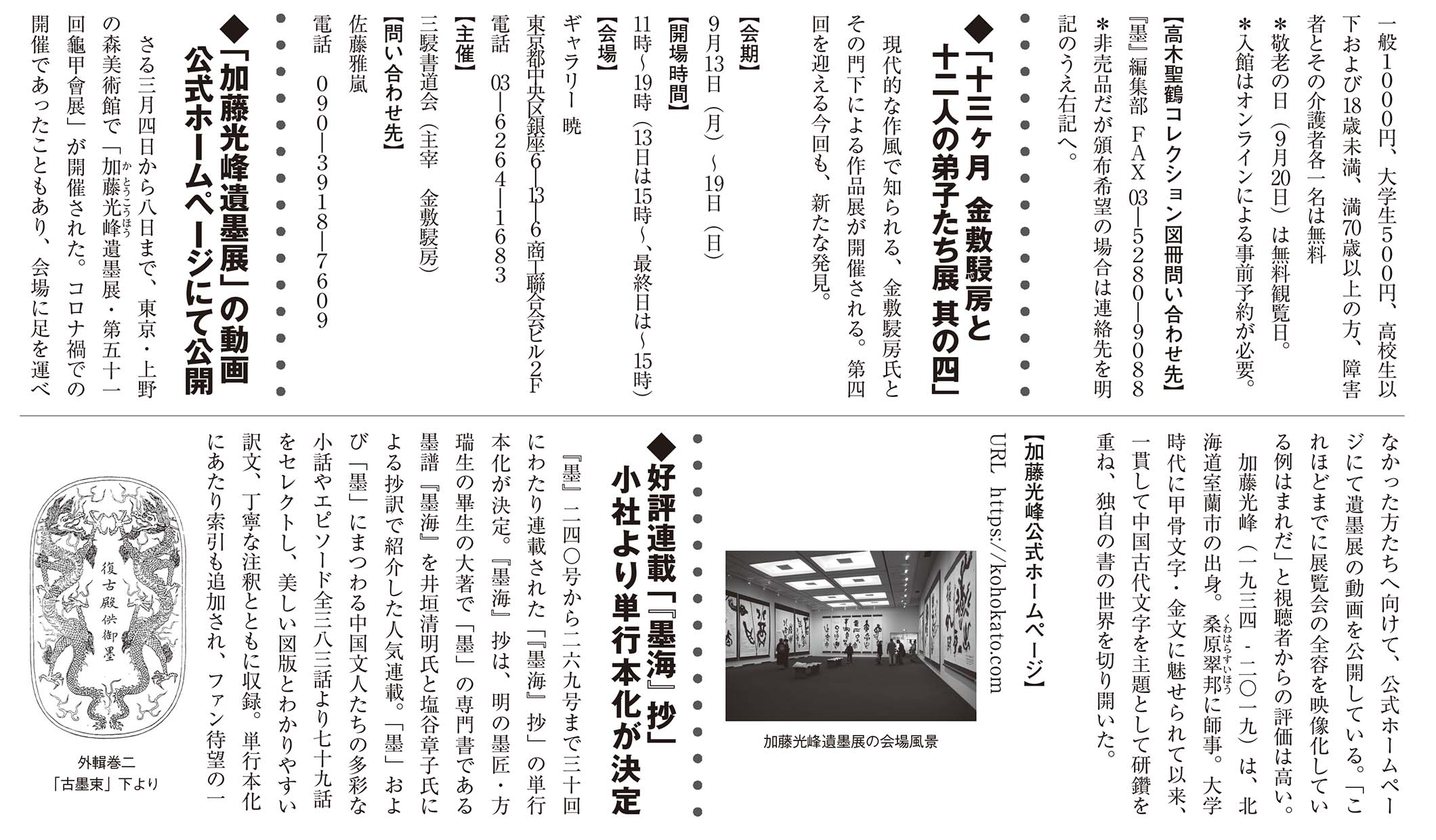 墨・2021年7・8月号(271号)「墨らんだむ」に、加藤光峰遺墨展の動画公開が紹介されました。